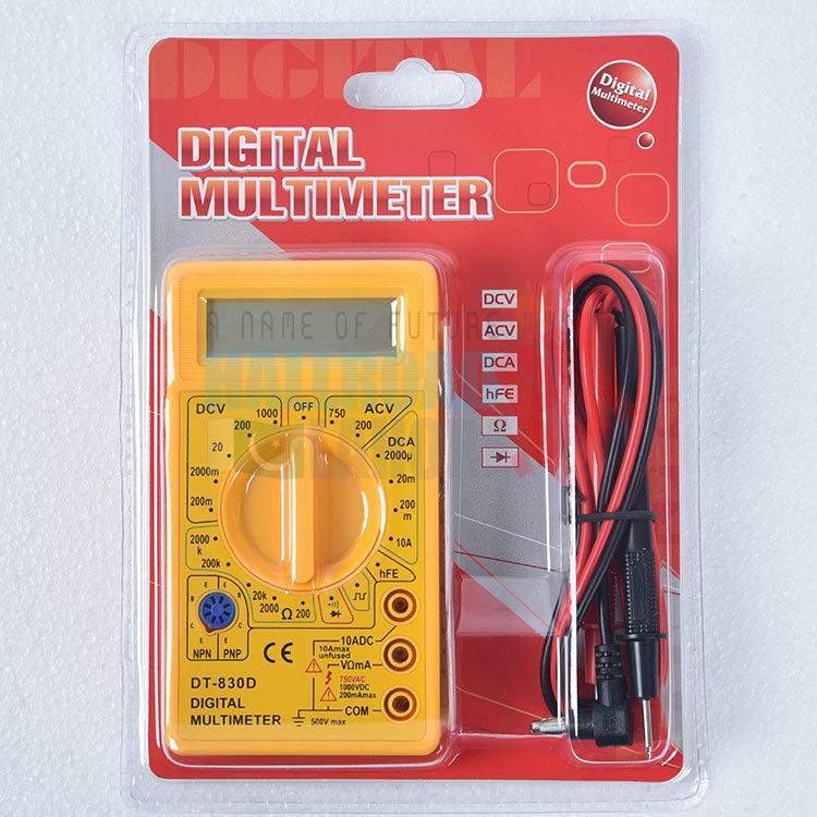 DT830D DMM Mini LCD Display Digital Multi Meter is an electronic measuring instrument that combines several measurement functions in one unit. Digital Multimeter DT830D includes basic features such as the ability to measure voltage, current, and resistance. Digital multimeters (DMM, DVOM) display the measured value in numerals, and may also display a bar of a length proportional to the quantity being measured. A multimeter can be a handheld device useful for basic fault finding and field service work, or a bench instrument that can measure to a very high degree of accuracy. They can be used to troubleshoot electrical problems in a wide array of industrial and household devices such as electronic equipment, motor controls, domestic appliances, power supplies, and wiring systems.DCV: 200m-2000m-20-200-1000V±0.5%