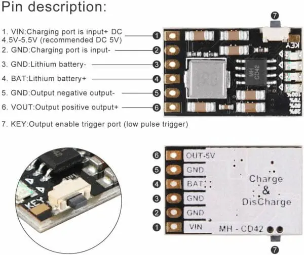 MH-CD42 module offers simultaneous charge and discharge, lithium battery protection, and a 4 level LED indicator. Connect any kind of 3.7V Lithium battery to have a 5V output with current up to 2.1A.