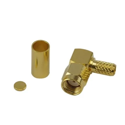SMA male 90 degree connectors (inside threads with male inner pin); Termination: cable-crimp; Impedance: 50 ohms Connectors made from gold-plated